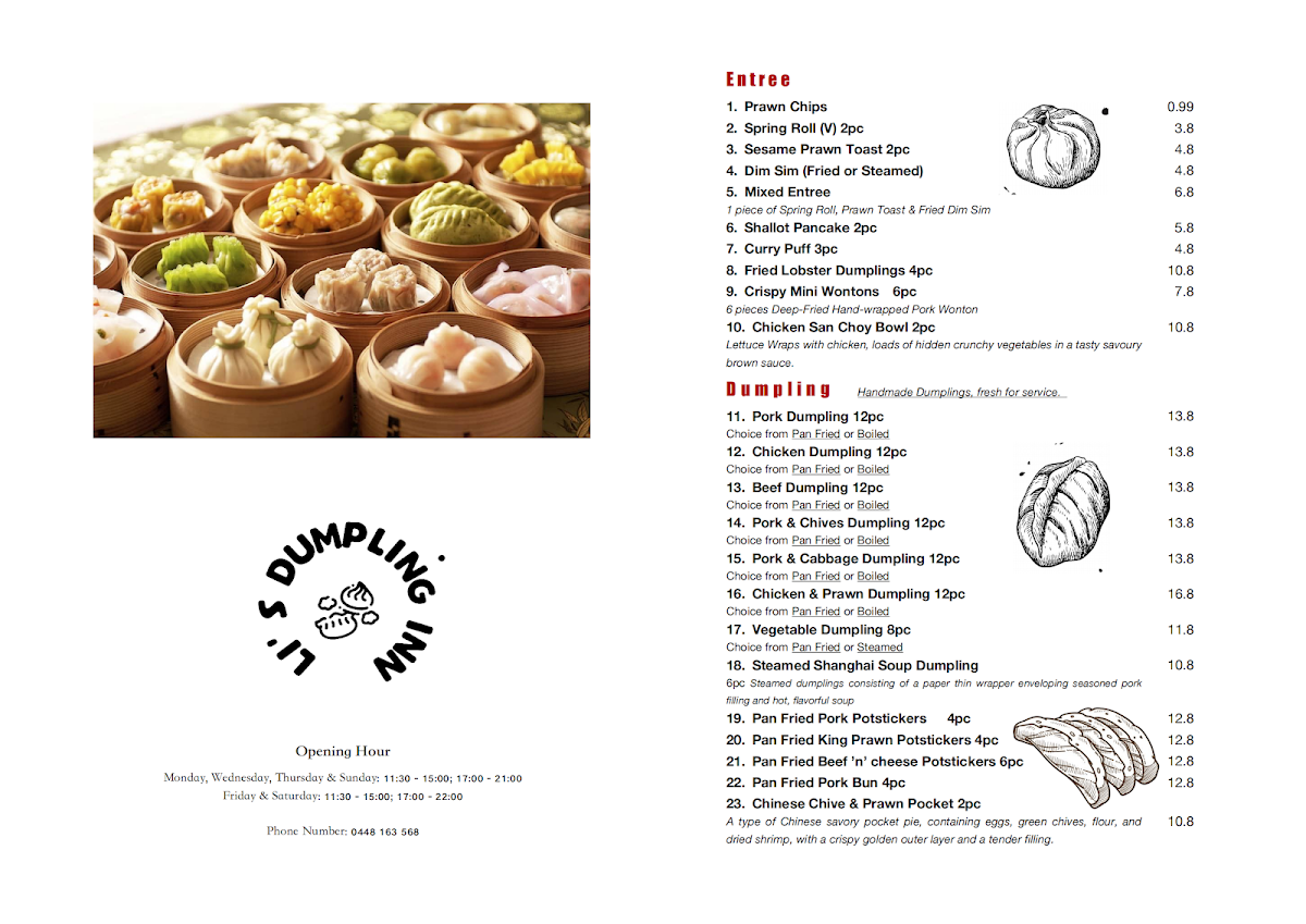Nestled in the heart of Wanniassa at 1/33 Gartside St, Li's Dumpling Inn welcomes you to explore an exquisite menu that celebrates both tradition and innovation in every bite. Our dishes are crafted with care and authenticity, aiming to provide an unforgettable dining experience that will make you come back for more. Start your meal with our tantalizing Pork Dumplings or the crispy delight of our Spring Rolls. Savor the rich flavors of our Mongolian Beef Noodle or dive into the delicious broth of our Steamed Shanghai Soup Dumplings. Seafood lovers will relish the Pan Fried Prawn Potstickers and the Stir Fry King Prawns that embody the essence of ocean-fresh goodness. If you’re in the mood for a kick, don't miss out on our Szechuan Chicken, a dish that combines spice and savory flavors to perfection. And, of course, our famed Pan Fried Pork Buns - 4pc and Fried Lobster Dumpling offer a taste experience like no other. Open on Reconciliation Day, Li's Dumpling Inn is more than just a meal; it's a celebration of flavors that bridges cultures and brings people together.